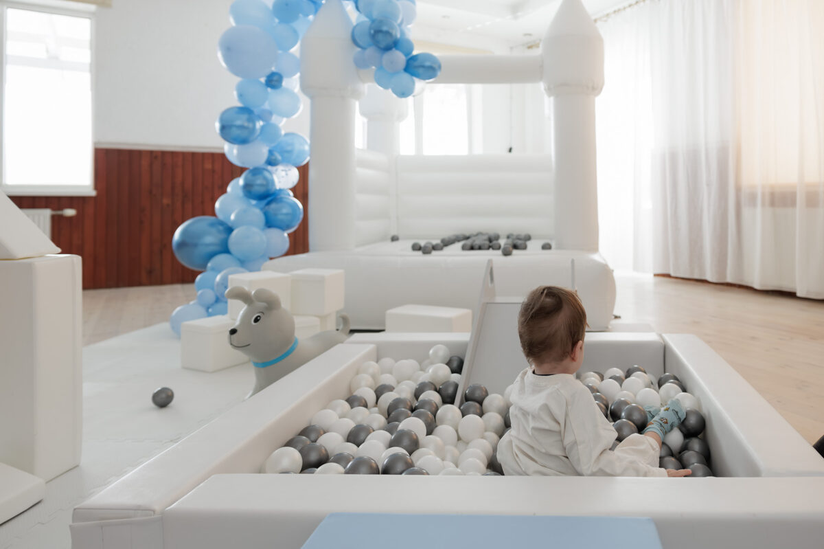 Piepūšamajā atrakcijā: kāpšļi, šķēršļi, slīdkalniņš, lecamā zona.